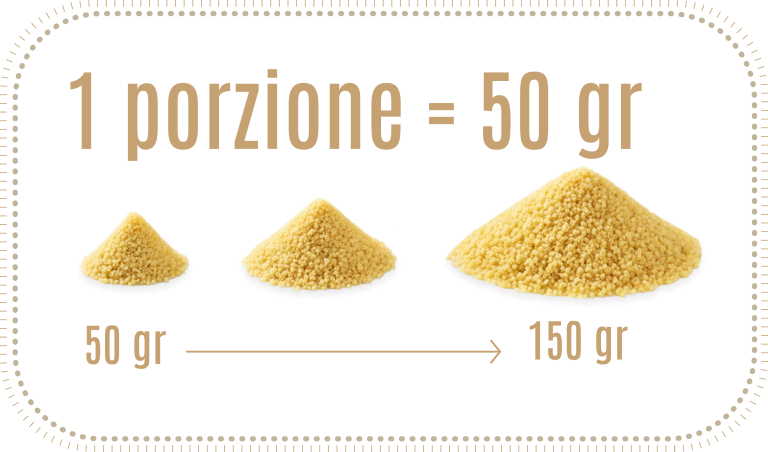 Grazie all’alta qualità della materia prima e del processo di lavorazione, il nostro couscous una volta reidratato, triplica il suo volume: basta una piccola porzione di 50 gr per ottenere un piatto saziante, leggero e gustoso.